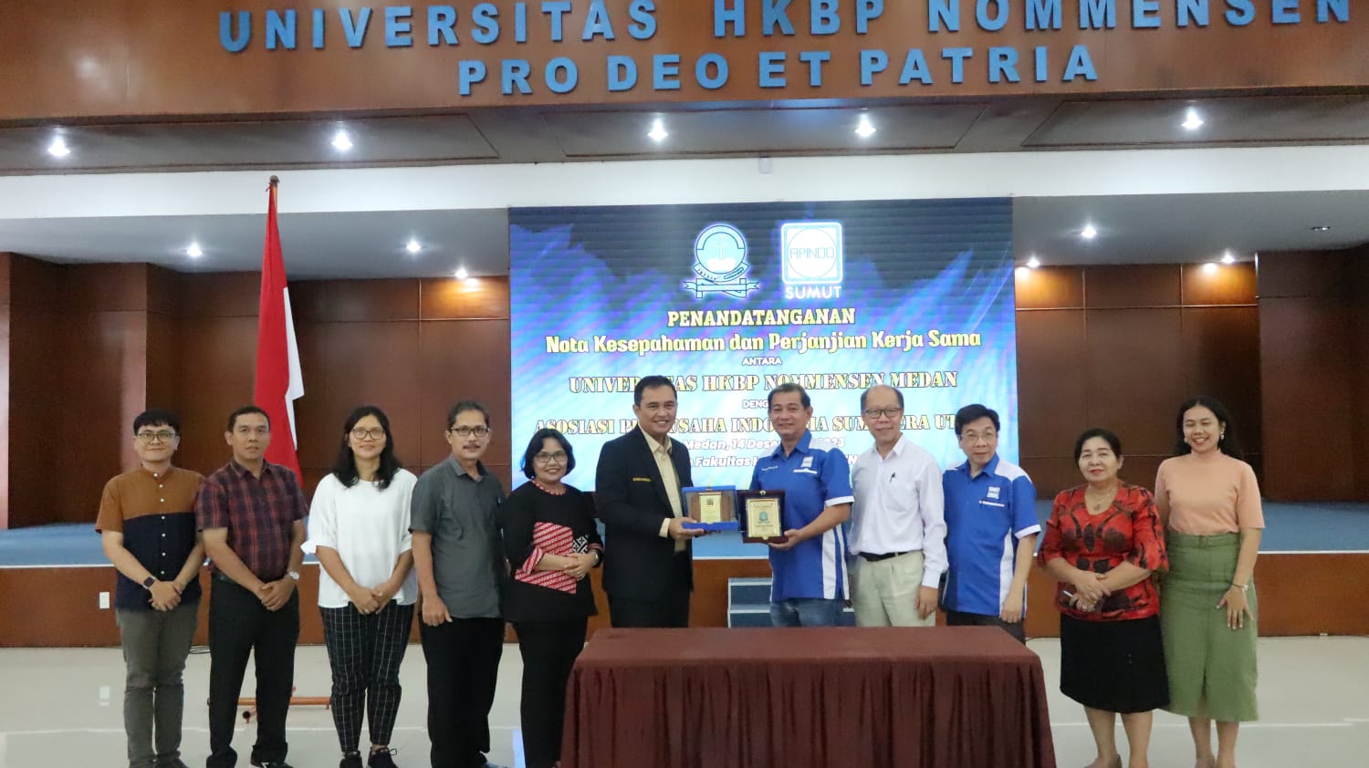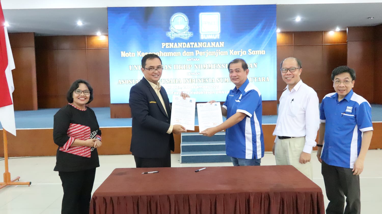 Penandatanganan Nota Kesepahaman dan Perjanjian Kerjasama APINDO Sumatera Utara yang diwakili oleh Wakil Ketua Bapak Drs. Tarman Hartono, MM, Bapak Ng Pin Pin, SE., MM dan Ketua Bidang UMKM Bapak Tjoe Mun Tong, SE dengan Universitas HKBP Nommensen oleh Rektor Bapak Dr. Richard A.M Napitupulu, ST, MT dan Wakil Rektor dan juga para dekan.
